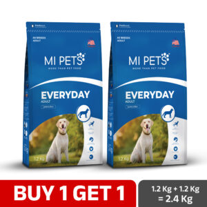 MI Pets Everyday Adult Dog Food is a dry-kibble dog food designed as a complete and balanced diet for adult dogs of all breeds.This formula typically uses high-quality animal protein (like lamb or chicken and their by-products) paired with rice and other digestible carbohydrate sources, making it easier on the stomach and good for digestion.Along with meat and grains, it includes cereals or cereal-byproducts, vegetable fibers, vitamins, minerals, omega-3 and omega-6 fatty acids, prebiotics and probiotics — all aimed at supporting overall health, digestion, immune function, and maintaining a healthy skin and coat.Because of its balanced nutrition, MI Pets Everyday Adult Dog Food supports healthy muscles, bones and joints, and meets the daily nutritional needs of an adult dog for energy, maintenance and vitality.this dog food provides a wholesome, digestible, and nutrient-complete diet for adult dogs, helping them maintain good digestion, healthy skin and coat, strong body structure, and overall well-being.