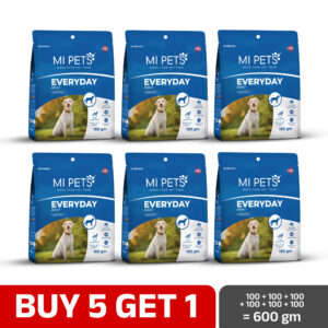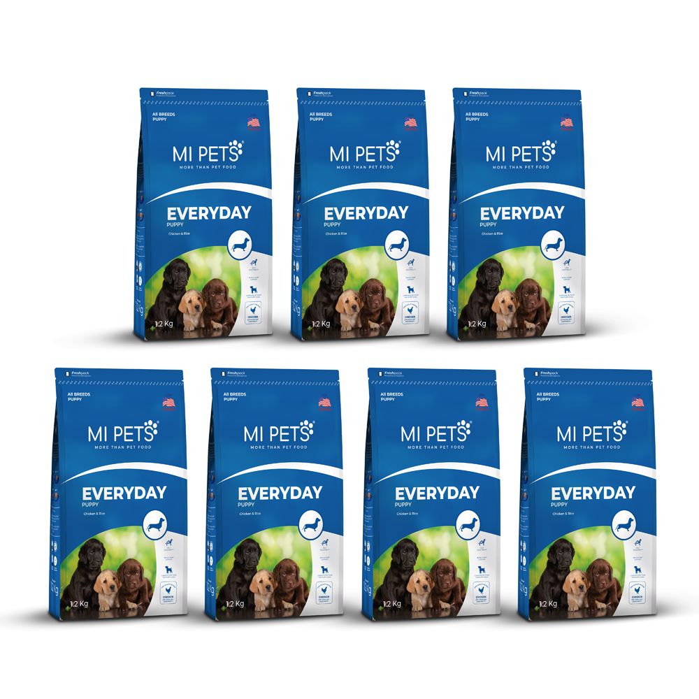 MI Pets Everyday Puppy Dog Food is a dry-food diet designed to give young puppies of all breeds the nutrients they need for healthy growth. The formula uses fresh chicken and rice — a digestible source of protein and carbohydrates — supplemented with a mix of grains such as brown rice, oatmeal, and vegetables and legumes like peas, sweet potatoes, lentils, broccoli, and kale to add fibre, vitamins, and minerals. Beyond basic nutrition, the food includes beneficial components like fish oil (providing omega-3 fatty acids and DHA), dried egg powder, chia seeds and other natural ingredients to support brain and nervous-system development, a healthy heart, and strong muscles and joints.To support digestion and gut health — especially important for growing pups — MI Pets Everyday Puppy also contains prebiotics and probiotics, plus a balanced fibre ratio from grains and vegetables to help maintain good stool quality.Overall, this puppy food aims to offer a complete and balanced diet: supporting muscle and bone development, healthy digestion, immune-system strength, skin and coat health, and general growth — as formulated by nutritionists to meet recognised standards