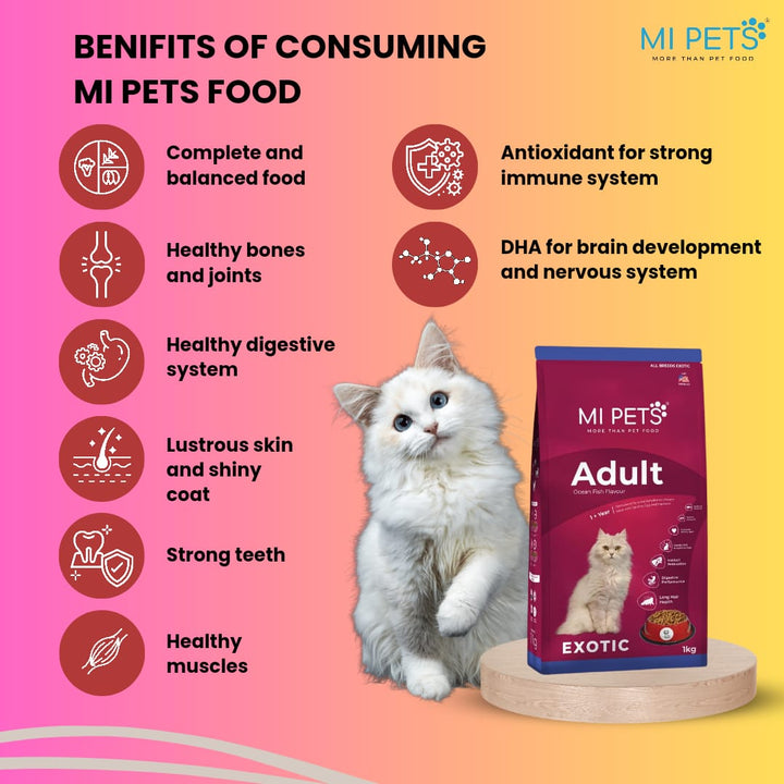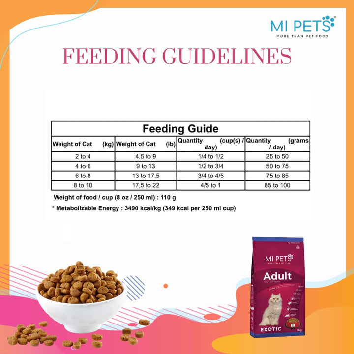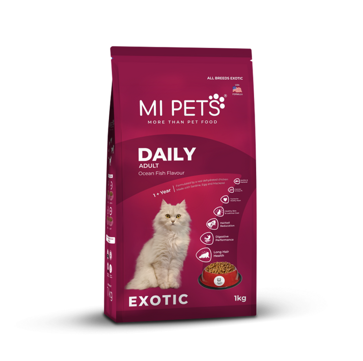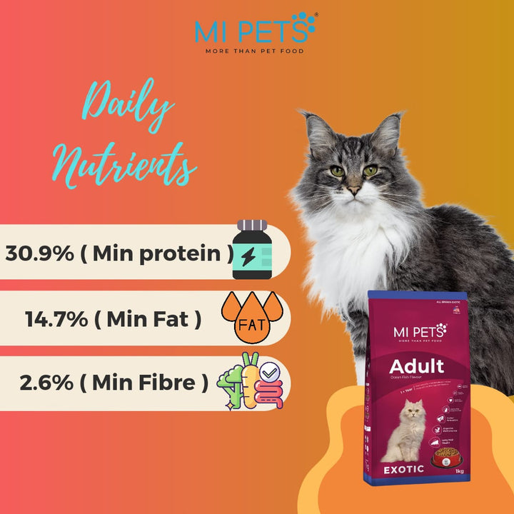 MI Pets Adult Cat Food for Exotic cats is complete and balanced Nutrition for All Breeds. The product is formulated and designed by our veterinarians and nutritionists professional who are having experience of more the 36 years in pet food product development in LISA & European Market. The product is especially designed to meet the Standard of Association of American feed Control. Official (AAFCO)